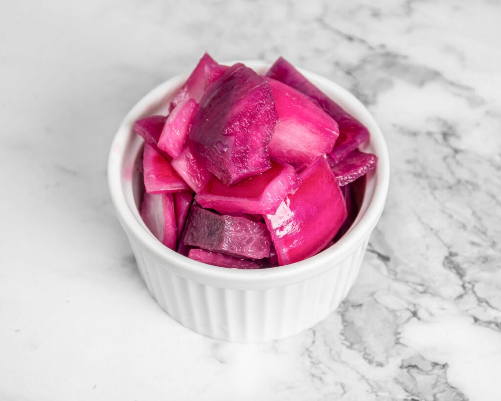 With fresh bananas, strawberries, blueberries and apples. Served with whipped cream, finished with icing sugar.